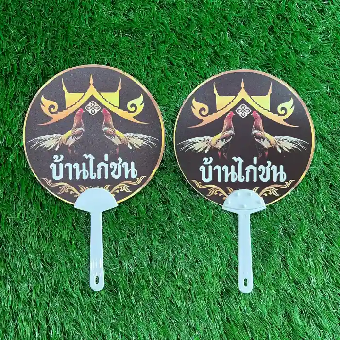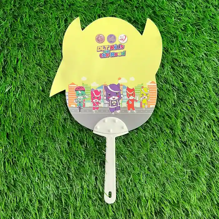 โรงงานรับผลิต พัดพลาสติก ขั้นต่ำ 300 ชิ้น พิมพ์ไม่จำกัดสี (พิมพ์ หน้า-หลัง ไม่เหมือนกันได้) สีสด พัดไดคัททรงอะไรก็ได้ พัดด้าม 5 ปุ่ม