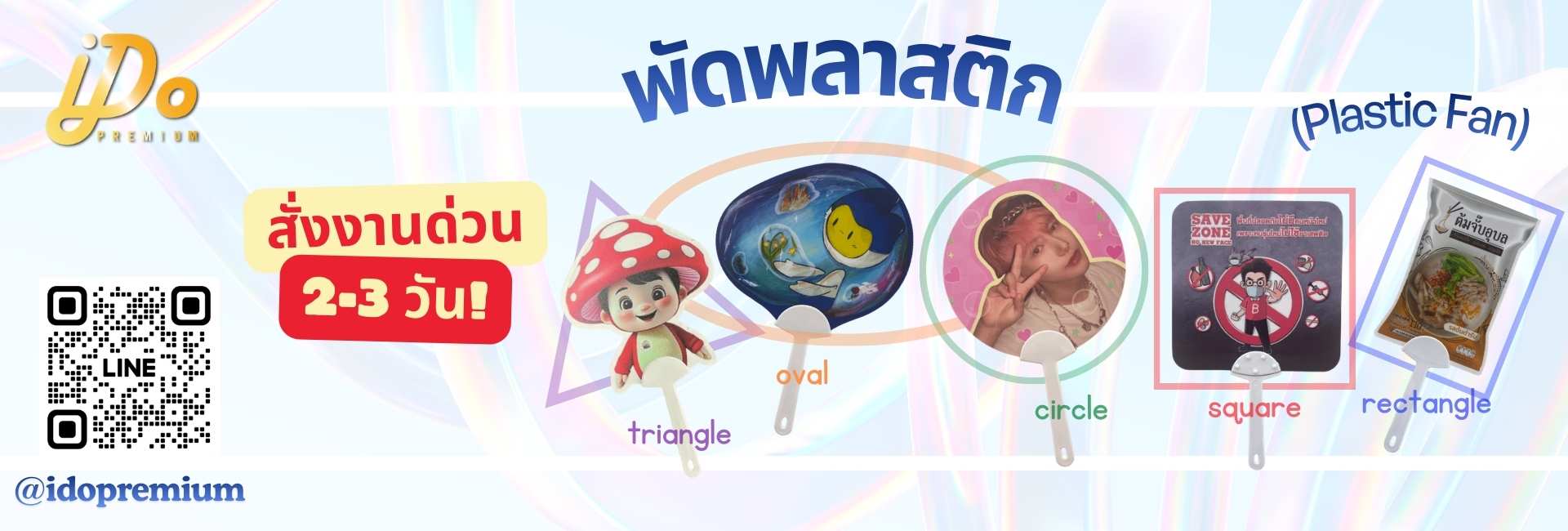 โรงงานผลิตพัดพลาสติก ไอดู พรีเมี่ยมรับผลิตพัดพลาสติก พร้อมสกรีนโลโก้ และข้อความ ได้หลากหลายสี ไม่จำกัดจำนวนสี ด้วยระบบการพิมพ์ โดยเครื่องแบบออฟเซท พิมพ์ได้จำนวนมาก และรวดเร็ว สามารถทำได้หลากหลายรูปทรง มีทั้งพัดกลม พัดเหลี่ยม พัดรูปหัวใจ พัดหน้าดารา และรูปอื่นๆ พัดไดคัทตามแบบที่ลูกค้าต้องการ พัดพลาสติกจะมาพร้อมด้ามจับที่แข็งแรง มั่นคงไม่หลุดง่าย เป็นพัดด้าม 5 ปุ่ม พัดพลาสติกเหมาะกับใช้เป็นของแจกเป็นของที่ระลึก และใช้ประโยชน์ได้ทุกโอกาส มีขนาดกระทัดรัดพกพาง่าย มีสีสันสวยงาม และพิมพ์โลโก้ ข้อความได้โดดเด่น เหมาะในการนำไปทำโฆษณาประชาสัมพันธ์ เป็นพัดแจก พัดประชาสัมพันธ์งานต่างๆ ได้ดี